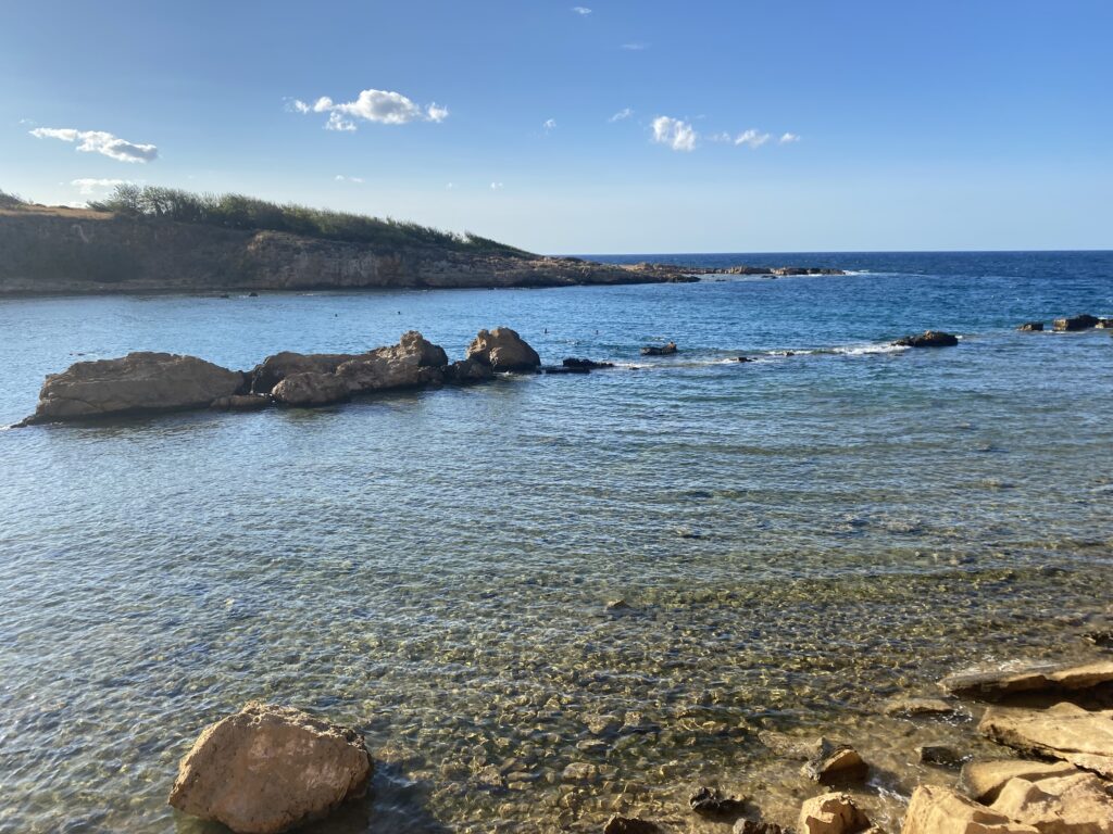 Dann ging es um 15:15 ca 5 km weiter zur Pamela Beach! Eine Schöne Bucht mit bissigen kleinen Fischen! Man wurde manchmal erschreckt wenn die zugeschnappt haben! Man konnte rechts oder links an der Bucht entlang laufen und es gibt auch kleine Höhlen …