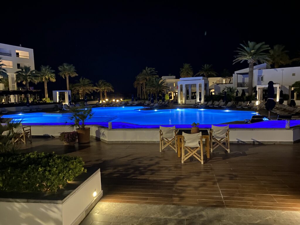 Um 19:35 waren wieder im Hotel und haben uns zurecht gemacht für das Abendessen. Heute war das Buffet echt super lecker! Danach zwei Runden Skibo am Pool auf der Hollywoodschaukel mit folgendem Blick: