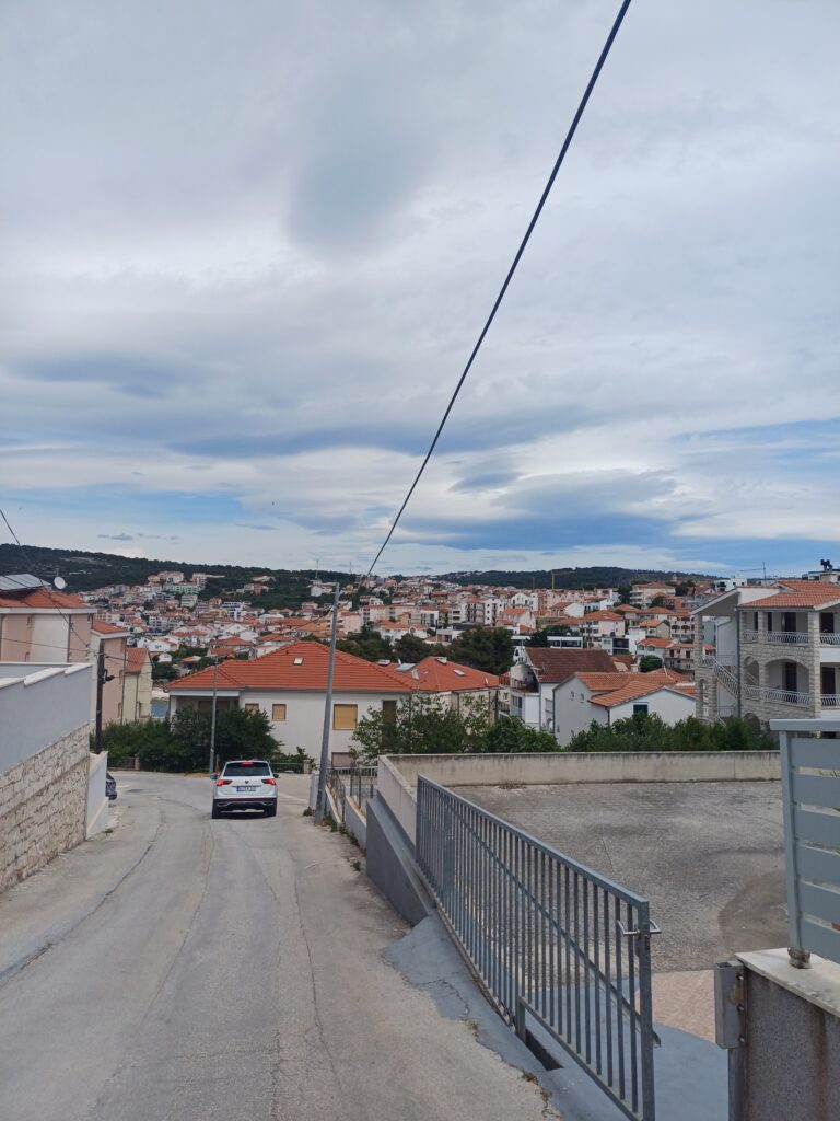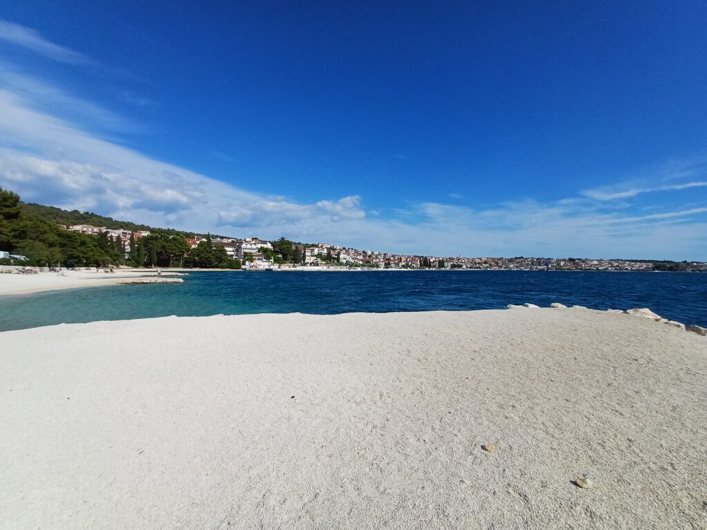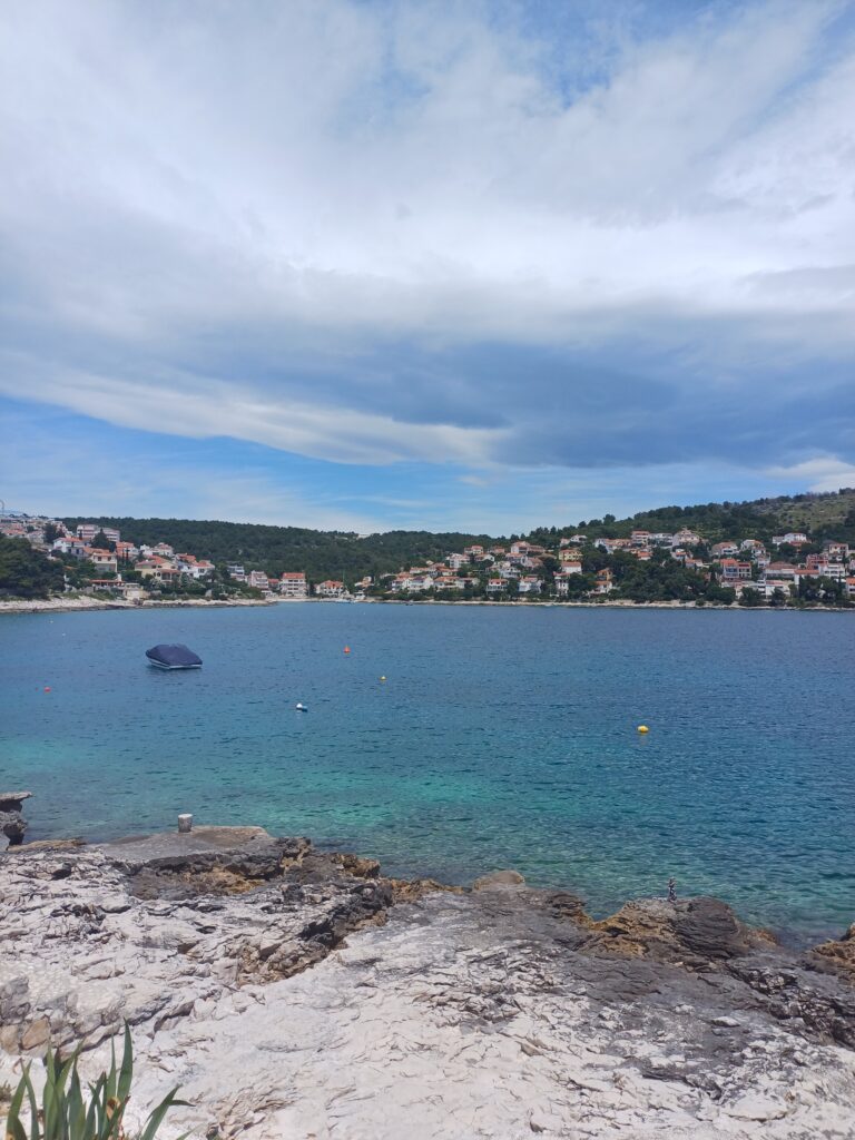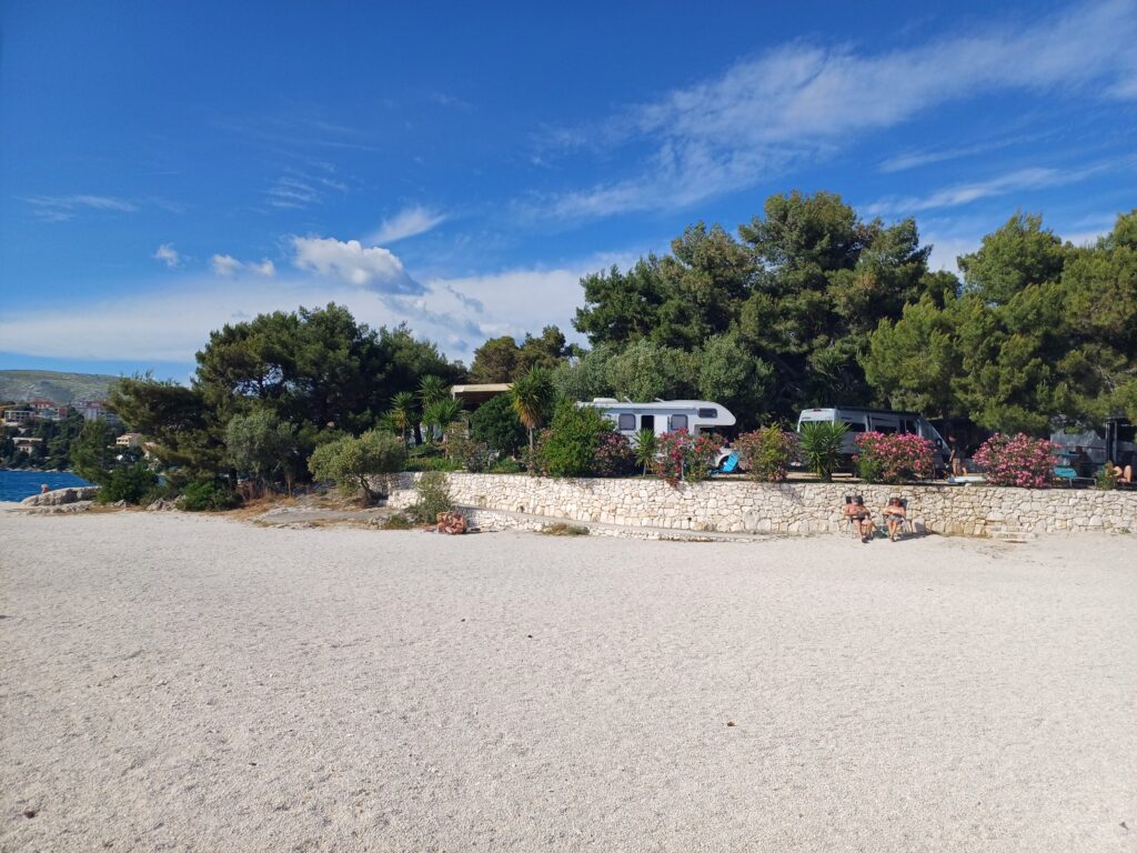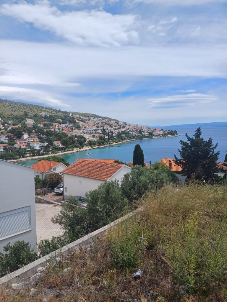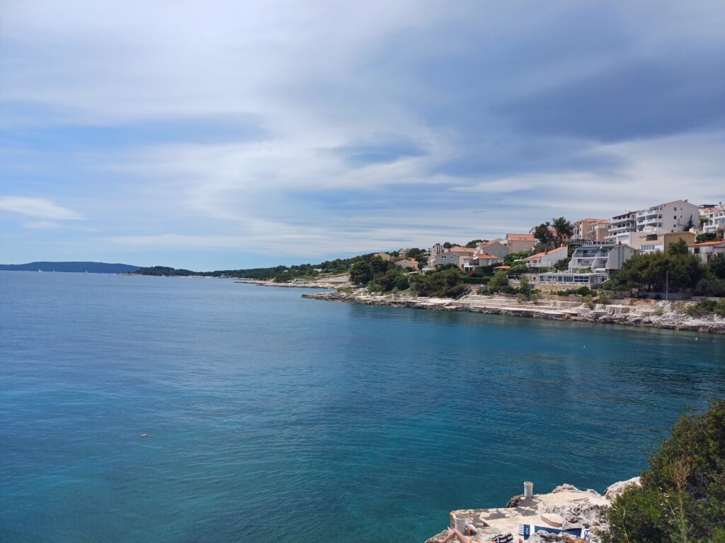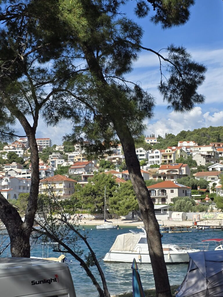 Diese Nacht hat Tammy auf den Hubdach geschlafen und zwar gut und lange. Erst um kurz nach 9 aufgewacht und schön gefrühstückt. Danach wurde der Camper etwas gereinigt und um 12 Uhr sind wir los über die Hügeln auf die andere Seite von Okrug (2,8 km) gelaufen. An der Küste ein Eiskaffe getrunken und den tollen Blick genossen.